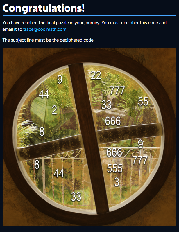 This final puzzle uses a cell phone to correlate the numbers into letters (remember texting in the 2000's? It uses that!). Once the message was deciphered, users would submit the phrase to the trace@coolmath.com email to be entered into a raffle to win one of 5 free Steam keys for TRACE: Definitive Edition.